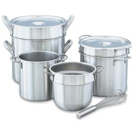 Ideal for delicate food preparation, reheating, preheating and moisture-free cooking. 18-8 stainless steel. Solid welded stainless steel loop handles for durability and easy cleaning. Rounded corners on inset pan for easy mixing. Feature conductive bottoms that distribute heat evenly. Insets fit snug to speed cooking time. Complete set includes inset, pot and cover. Double boiler sets packed 1 per carton. Slotted covers and insets only are not NSF Certified. Made in U.S.A. 9-3/8" diameter. 7 quart capacity. 12.00 L. 10.75 W. 10.75 H.
