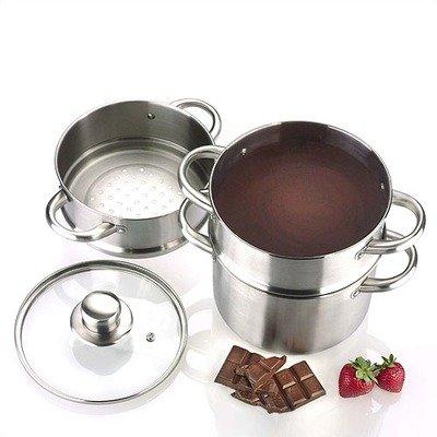 Seamlessly melt chocolate without scorching it, and perfectly steam vegetables with this stainless steel double boiler that has been meticulously designed to inspire the epicurean in all of us. The tempered glass lid securely seals over the rim to trap in moisture while still allowing the chef to keep an eye on their food's progress, and the aluminum encapsulated base allows for even heat distribution, making this double boiler an essential, versatile tool for any kitchen. Features: Aluminum Encapsulated Base for even heat distribution Round Riveted handles for easy handling and security Can be used on all stovetops Set Includes: 2-Quart Double Boiler Steamer Insert Tempered Glass Lid Recipe Book.